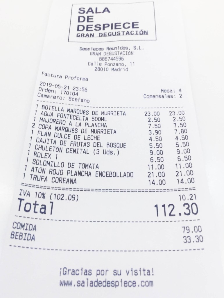La carta también es peculiar pues son unas carpetas con albaranes escritos a bolígrafo que ofrecen los platos de producto, con algunos clásicos ya en la casa, como el Chuletón Cenital, las Trufas Cárnicas ó su famoso “Rolex”.
