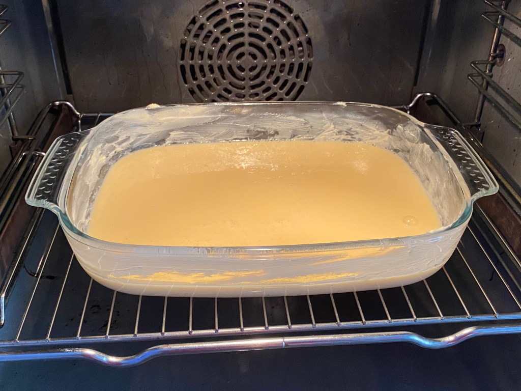 5- En un recipiente metálico o de cristal apto para hornos, engrasamos (mantequilla o aceite girasol) el interior para evitar que nuestra quesada se peque con el horneado.