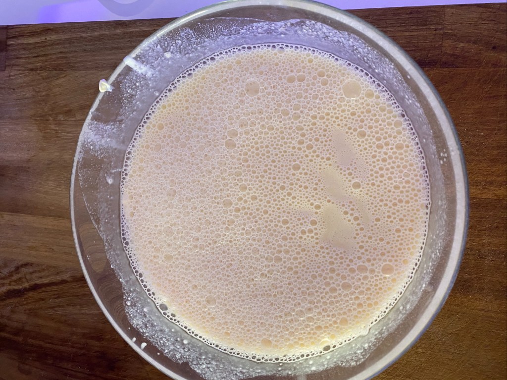 6- Vertemos la mezcla en el recipiente utilizando una cuchara hacía abajo o un colador de metal (igual con para tamizar harina), como distribuidor para que no genere burbujas.