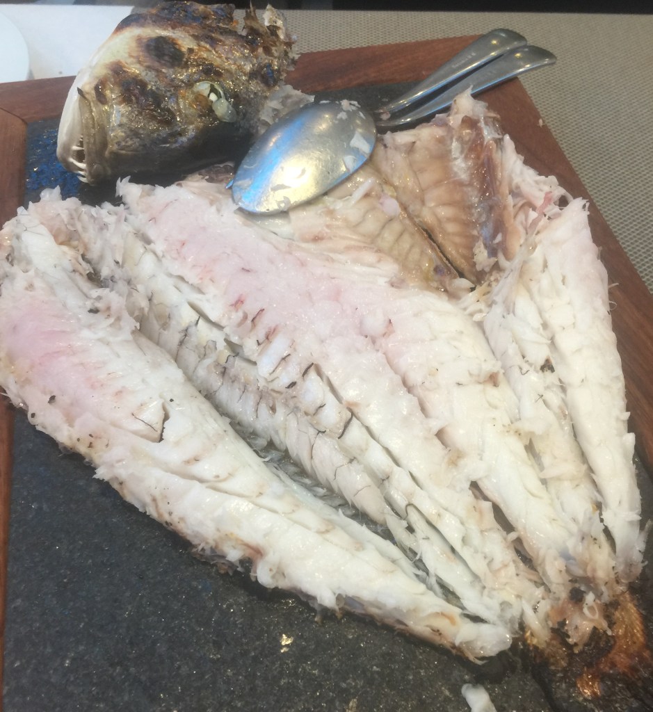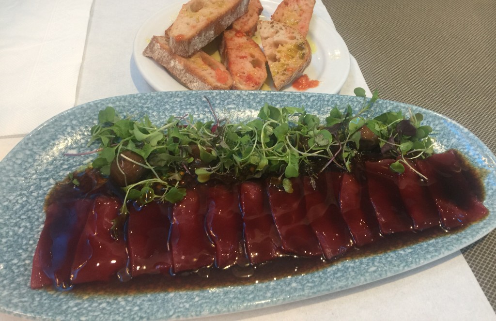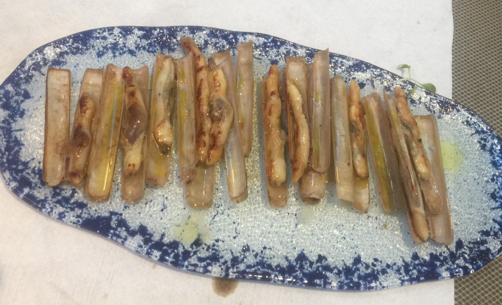 En nuestra visita tuvimos la ocasión de degustar las anchoas, un tataki de atún (espectacular,) los canyuts (un típico producto del mediterráneo catalán, que son una especie de navajas del Delta del Ebro), la famosa gamba de Roses y para finalizar un “déntol”. El dentón o dientes (Dentex dentex) es un pez, perciforme, de la familia de los espáridos (familia que incluye el sargo, el raspallón, la dorada, la oblada etc.). y su nombre (déntol) le viene de las fuertes dientes que posee, sin duda, EXCELENTE.