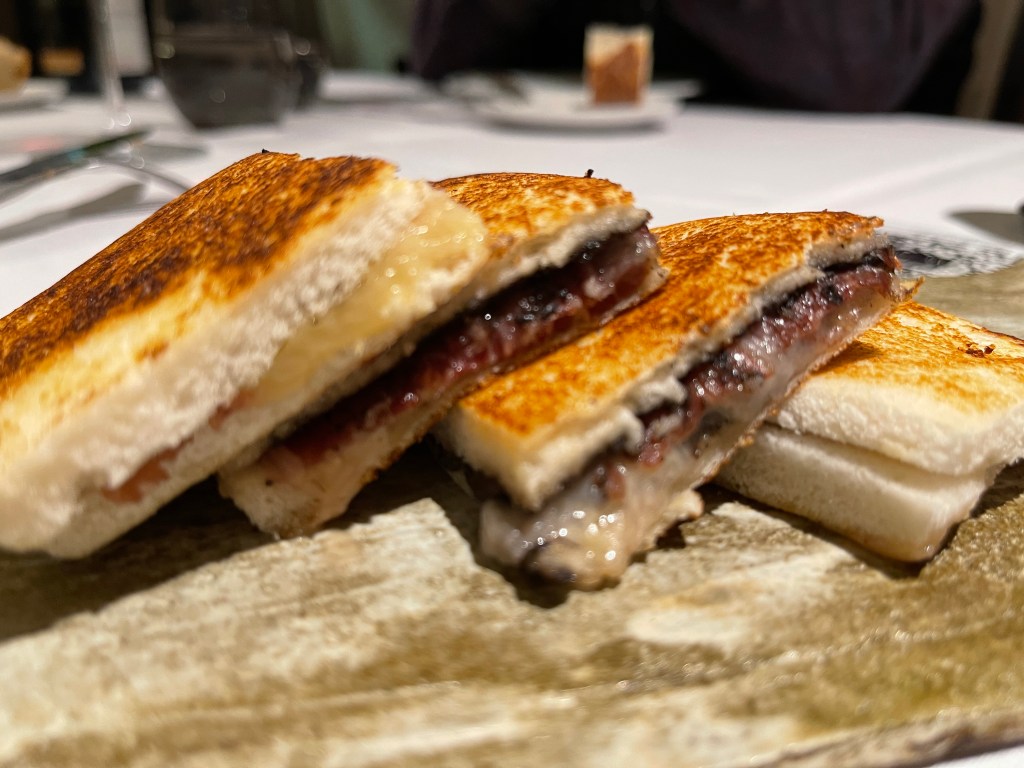 También probamos, porque que nos habían hablado maravillas, la Tortilla abierta de gambas de Palamós y su Bikini de queso Fermió de La Balda, jamón ibérico y trufa, ambos platos compartidos entre “4 patas” que todos los presentes nos entusiasmaron.
