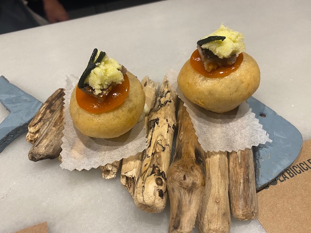 Varias cosas nos parecieron especialmente llamativas: la ‘Gilda’ que se degusta en una cuchara, la tortilla de patata liquida, bocadillo aireado, donde se rellena de espuma de queso un pan y se termina con tataki de lomo bajo y pimiento asado de isla ‘espectacular’, bocado de lengua de res, etc.