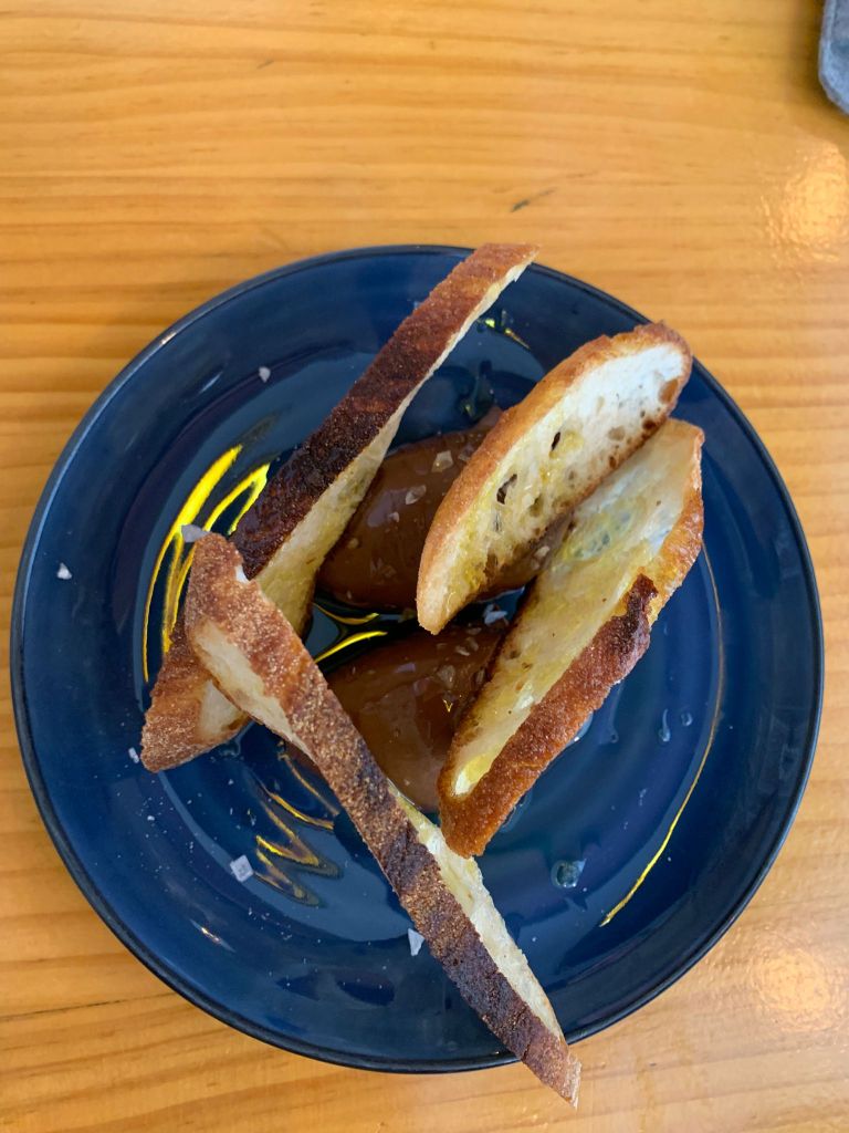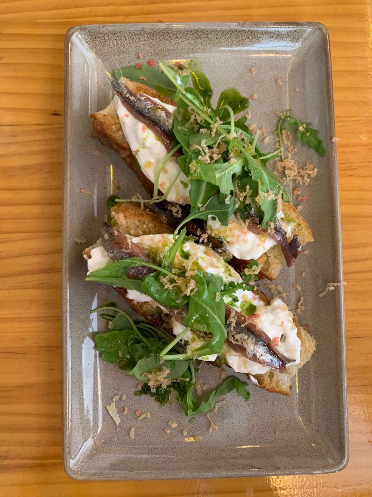 O unas croquetas de jamón, también en generoso formato, súper-crujientes con un rebozado mas “panko” que tradicional. Una focaccia elaborada para ellos por el horno de pan Obelisc, a pocos metros de su local, y que ellos “finalizan” con burrata, anchoa del cantábrico, rúcula, aceite de hierbas y botarga. Tan sencillo como sabroso.